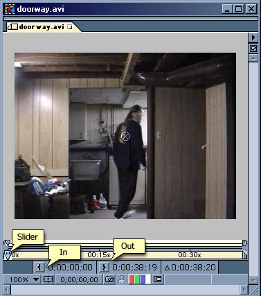 You can use the slider to "scrub" through the clip to the point where you want it to first start. When you get to the frame that you wish to start the clip, press the button marked "In". Continue scrubbing after that until you find the point where you wish this clip to exit. The press the button marked "Out".