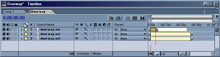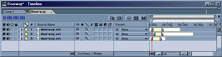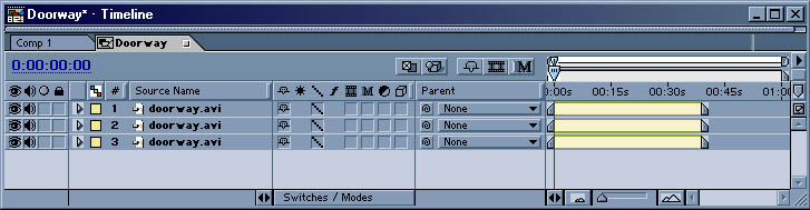 Drop 3 instances of the file containing the Doorway.avi footage onto the timeline.